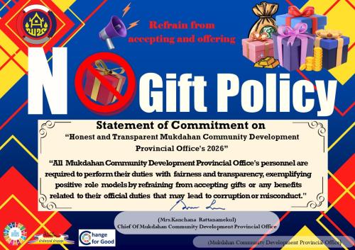 สพจ. มุกดาหาร มีนโยบาย “ไม่” รับของขวัญและของกำนัลทุกชนิดจากการปฏิบัติหน้าที่ (No Gift Policy) ประจำปีงบประมาณ พ.ศ. 2569 เพื่อเป็นการเสริมสร้างค่านิยมให้เกิดการประหยัด สร้างทัศนคติที่ถูกต้อง และป้องกันการเกิดผลประโยชน์ทับซ้อน